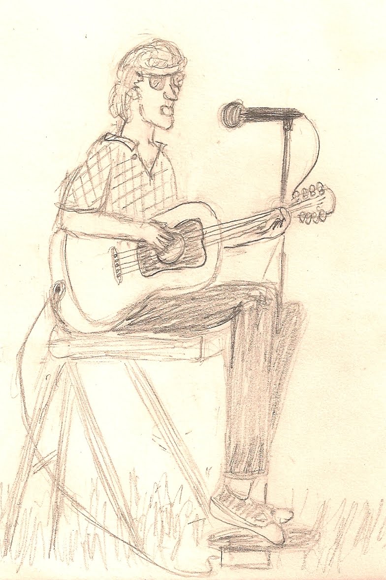 I curled up in the warm, dim park after work tonight and sketched the guitarist as he serenaded me with Beatles tunes. I was in such a cozy state of mind that I barely noticed I was having a conversation with a foreign student who had pulled up next to me. What am I drawing? Do I go to Harvard? Oh, I work at the theatre, that's cool. The sketch is good. He's Manny. He thinks I'm very cute.Wait...what?